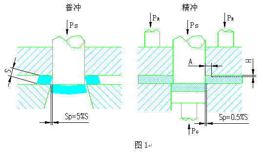 3、 精沖工藝原理 3.1、普沖與精沖的區別 我們常說的精沖,不是一般意義上的精沖(如整修、光潔沖裁和高速沖裁等),而是強力壓板精沖(見圖1)。PR-齒圈力、PS-沖裁力、PG-反壓力。