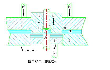3.3、模具工作原理 精沖機是實現精沖工藝的專用設備。如圖2所示,精沖時精沖機上有三種力(PS、PR、PG)作用於模具上。沖裁開始前通過齒圈力PR,經剪切線外的導板(6),使V形齒圈(8)壓入材料並壓緊在凹模上,從而在V形齒圈的內面產生橫向側壓力,以阻止材料在剪切區內撕裂和在剪切區外金屬的橫向流動。同時反壓力PG又在剪切線內由頂件器(4)將材料壓緊在凸模上,並在壓緊狀態中,在沖裁力PS作用下進行沖裁。剪切區內的金屬處三向壓應力狀態,從而提高了材料的塑性。此時,材料就沿著凹模刃口形狀,呈純剪切的形式沖裁零件。 沖裁結束後,PR和PG壓力釋放,模具開啟,由退料力PRA和頂件力PGA分別將零件和廢料頂出。並用壓縮空氣將其吹除。