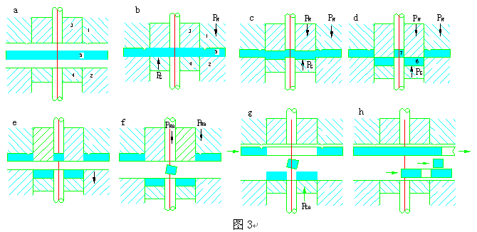 3.4、精沖工作過程(見圖3) a) 模具開啟,送入材料; b) 模具閉合,在刃口(沖裁線)內外的材料利用齒圈力和反壓力壓緊; c) 用沖裁力PS沖裁材料,壓緊力PR和PG全過程有效壓緊; d) 滑塊行程結束,沖件在凹模內,內孔廢料沖入落料凸模中; e) 齒圈力PR和反壓力PG卸載,模具開啟; f) 在施加齒圈力的位置,此時作用為:頂出內孔廢料和卸載衝壓搭邊的卸料力PRA; g) 在施加反壓力的位置,此時作用為:從凹模中頂沖件的頂件力PGA。材料開始送進; h) 吹卸或清除精沖件和內孔廢料。材料送進完成。