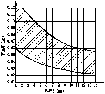 一般來說,厚料比薄料零件平直;低強度材料比高強度材料平直;壓邊力大比壓邊力小的平直。在凸模側的材料表面總是中凹的,凹模側總是中凸的。但如果零件還需要壓印、壓痕、切口、彎形等工序或用連續模沖裁,由於在零件上產生局部的變形或沖裁方向不同,致使平面度有較大的波動範圍。但無論如何,精沖件總是要比普通衝壓件的平面度好的多。圖3是在100mm距離上測定的一般直線度。
