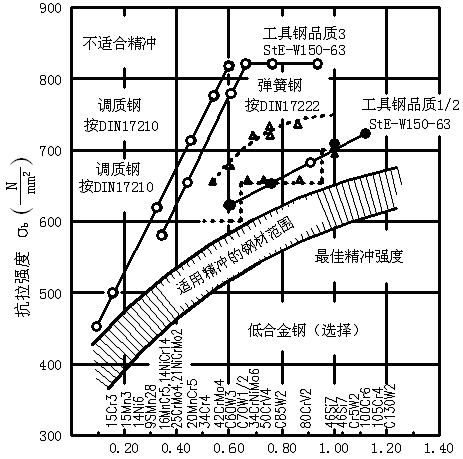 注:1.很好——理想的精沖材料,沖裁面光潔度高,模具壽命長。 2.良好——適宜的精沖材料,沖裁面光潔度號,模具壽命正常。 3.尚可——勉強的精沖材料,用於形狀複雜的零件時,沖裁面撕裂,模具壽命短。